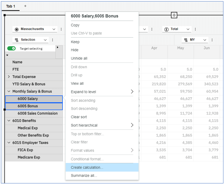 With Target selecting enabled, select row or column members to include in the calculation – click on the first member then control-click on subsequent members. Each selected member will be surrounded with a blue line.