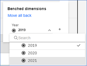 To move the benched dimension back to the Context, click on the plus sign to the right of the dimension or you can select Move all back to move all the dimensions on the bench back to the Context area. If you hover your cursor over the dimension, you can drag and drop the dimension onto the rows, columns or context area. Note that grab handles appear to the left of the dimension.